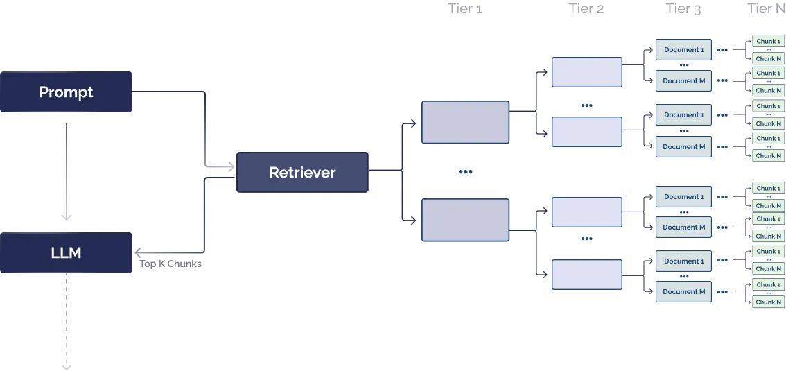 A document hierarchy is a powerful way of organizing your data to improve information retrieval. You can think of a document hierarchy as a table of contents for your RAG system. It organizes chunks in a structured manner that allows RAG systems to efficiently retrieve and process relevant, related data. Document hierarchies play a crucial role in the effectiveness of RAG by helping the LLM decide which chunks contain the most relevant data to extract.