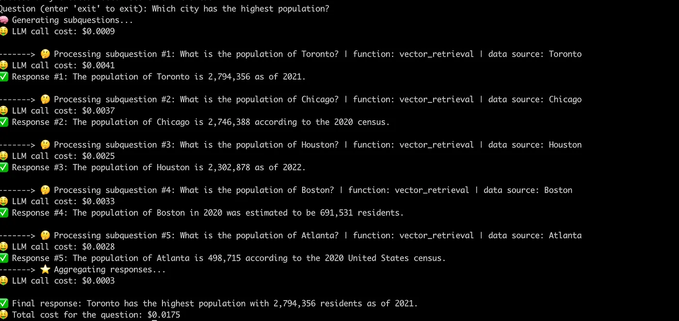 Let’s take the example of a question which asks ‘Which city has the highest population?”. To answer this question, the RAG system must generate answers to the following sub-questions as shown in the image below, before ranking the cities by population: