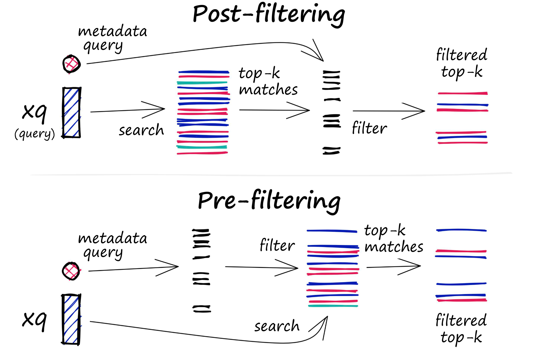 Post-filtering: In this approach, the metadata filtering is done after the vector search. This can help ensure that all relevant results are considered, but it may also introduce additional overhead and slow down the query process as irrelevant results need to be filtered out after the search is complete.