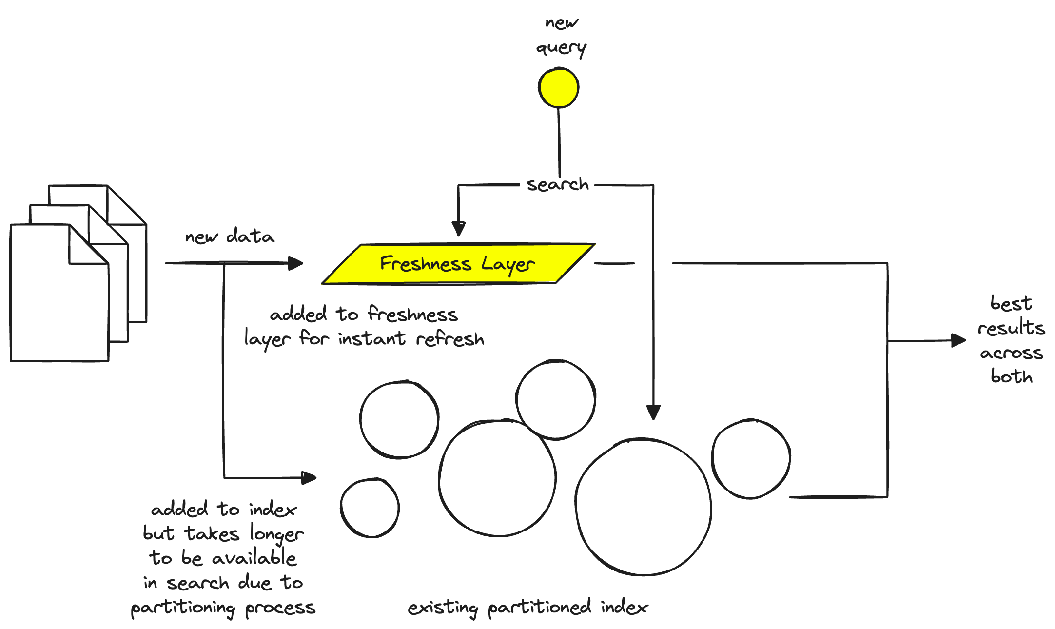 During this process, a query router can send queries to both the index and the freshness layer — solving the freshness problem. However, it’s worth noting that the freshness layer exists in compute instances, so we cannot store the full index there. Instead, we wait for the new vectors to be inserted into the index — once complete, they are removed from the freshness layer.