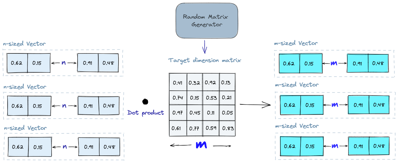 The basic idea behind random projection is to project the high-dimensional vectors to a lower-dimensional space using a random projection matrix. We create a matrix of random numbers. The size of the matrix is going to be the target low-dimension value we want. We then calculate the dot product of the input vectors and the matrix, which results in a projected matrix that has fewer dimensions than our original vectors but still preserves their similarity.