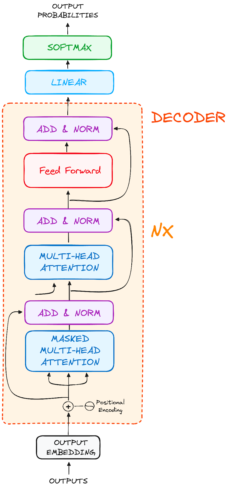 The decoder consists of a stack of identical layers (6 in the original Transformer model). Each layer has three main sub-components: