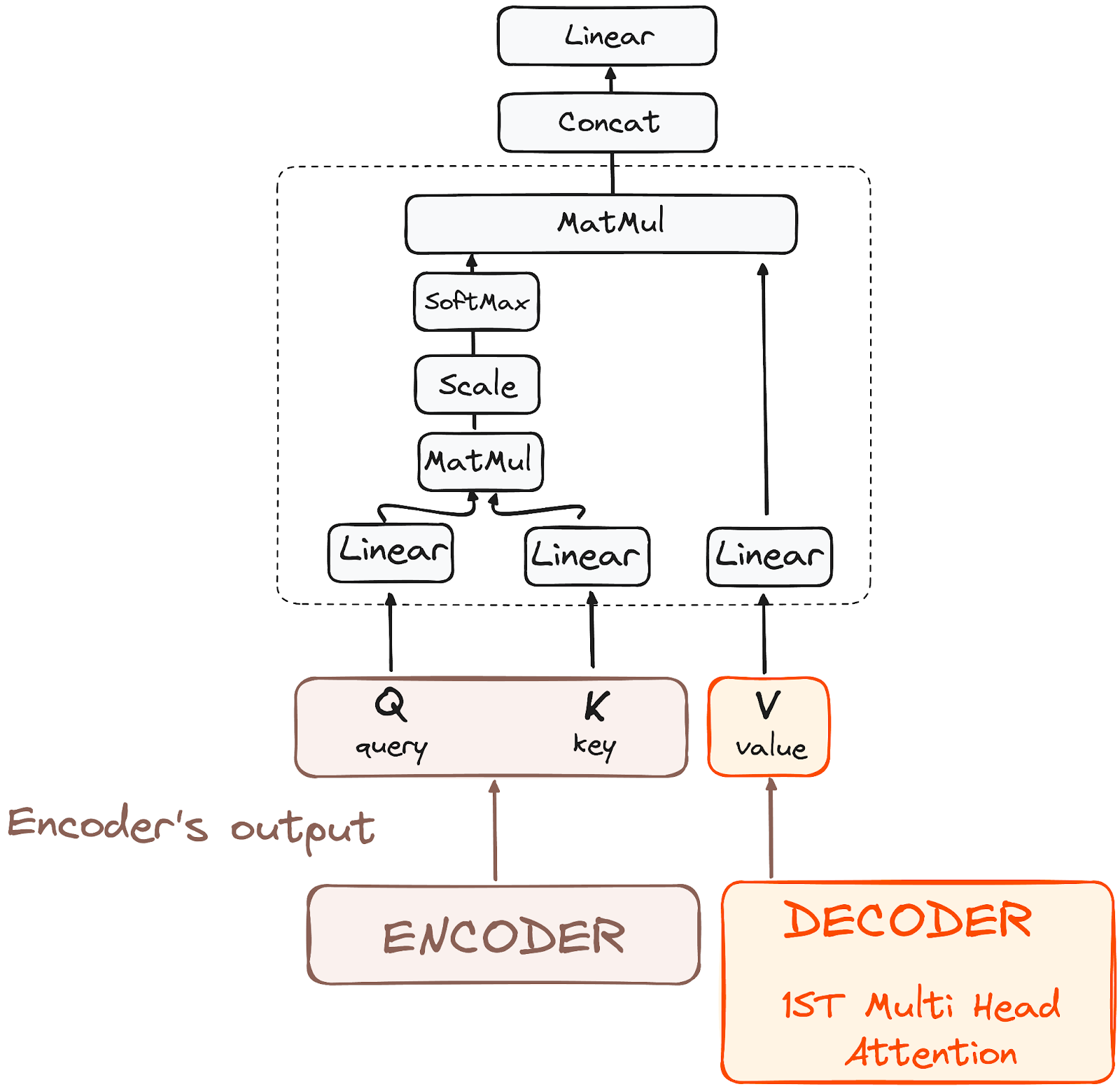 In the second multi-headed attention layer of the decoder, we see a unique interplay between the encoder and decoder's components. Here, the outputs from the encoder take on the roles of both queries and keys, while the outputs from the first multi-headed attention layer of the decoder serve as values.