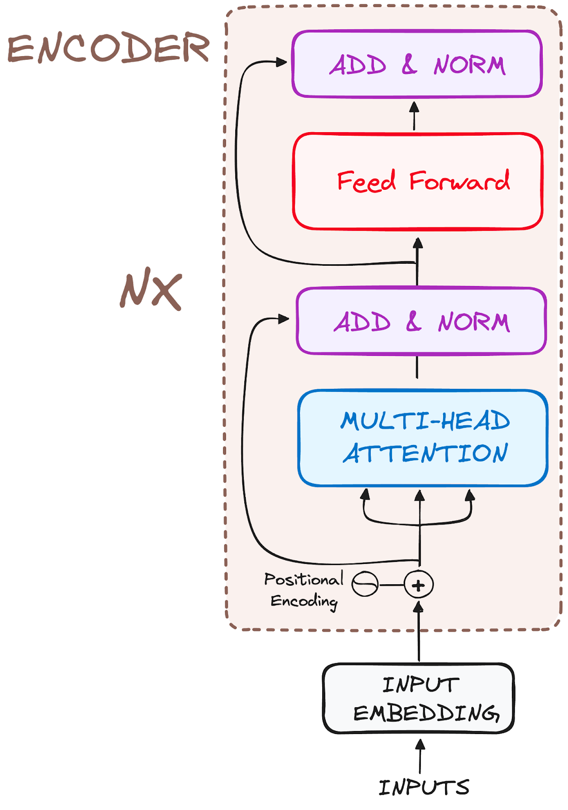 Following the embedding, again just like the decoder, the input passes by the positional encoding layer. This sequence is designed to produce positional embeddings.