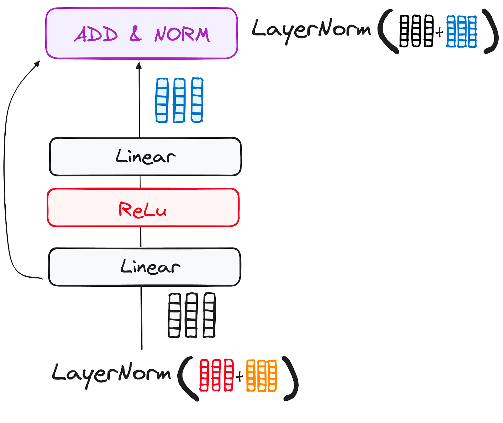 Picture this network as a duo of linear layers, with a ReLU activation nestled in between them, acting as a bridge. Once processed, the output embarks on a familiar path: it loops back and merges with the input of the pointwise feed-forward network.