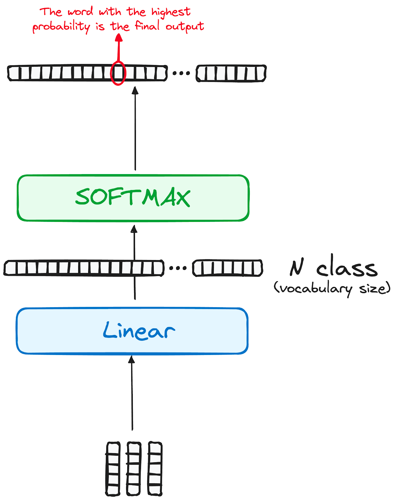 The final layer's output is transformed into a predicted sequence, typically through a linear layer followed by a softmax to generate probabilities over the vocabulary.