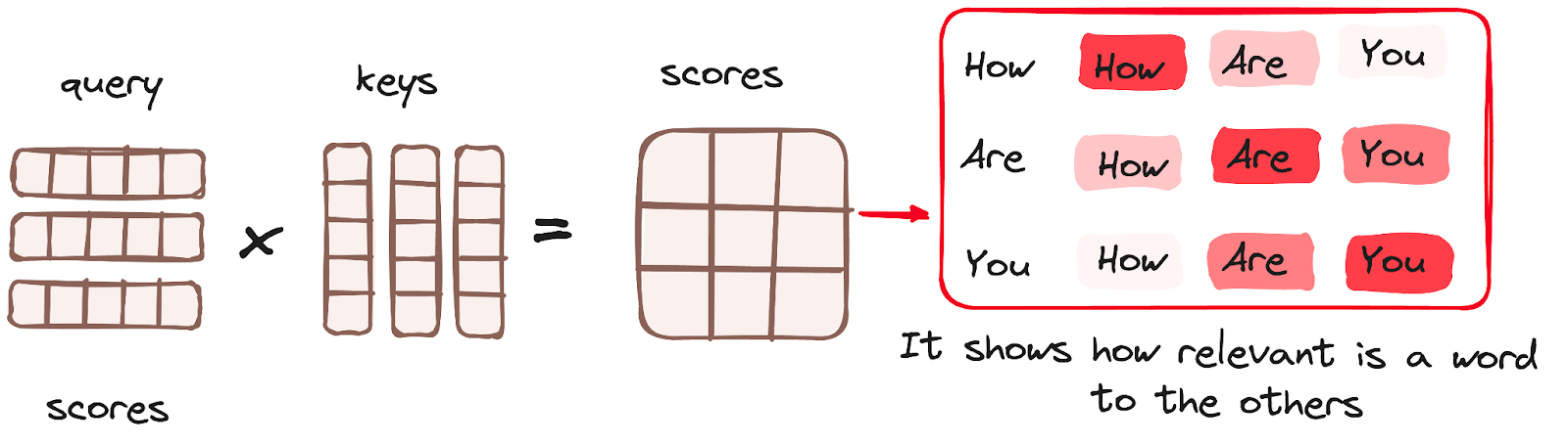 Once the query, key, and value vectors are passed through a linear layer, a dot product matrix multiplication is performed between the queries and keys, resulting in the creation of a score matrix.