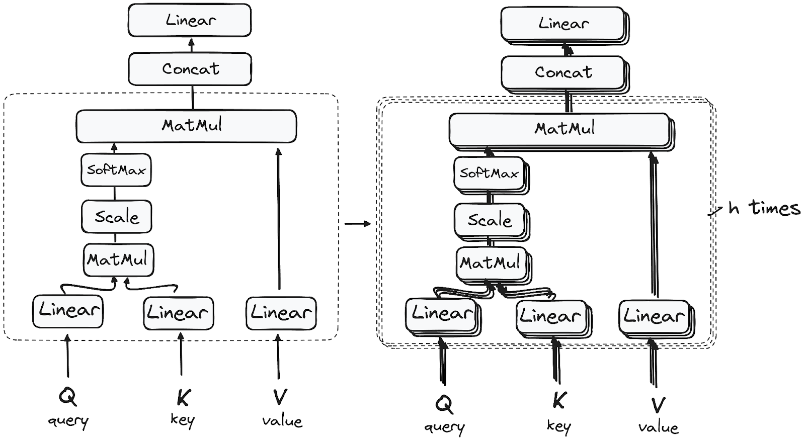 Remember that before all the process starts, we break our queries, keys and values h times. This process, known as self-attention, happens separately in each of these smaller stages or 'heads'. Each head works its magic independently, conjuring up an output vector.