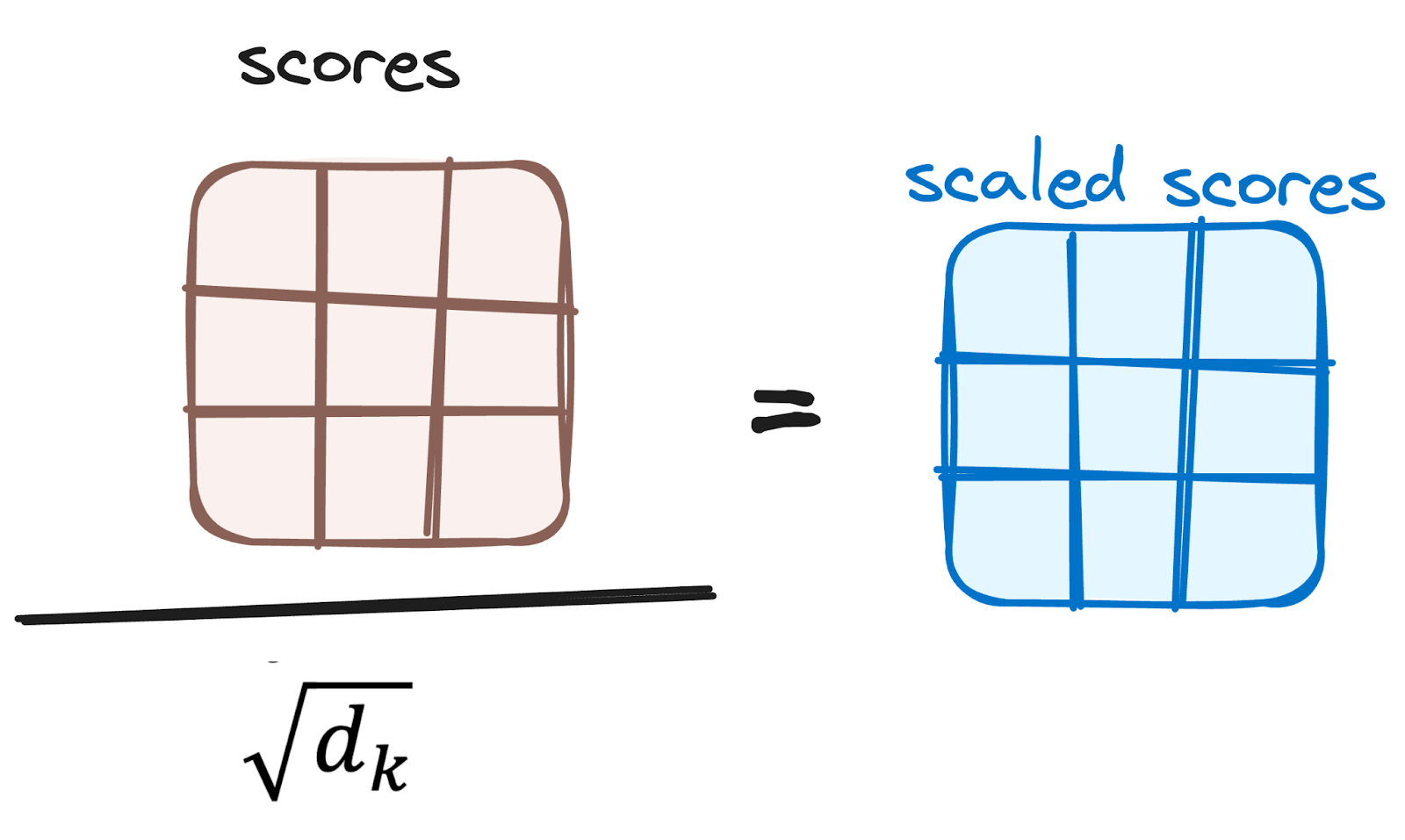 The scores are then scaled down by dividing them by the square root of the dimension of the query and key vectors. This step is implemented to ensure more stable gradients, as the multiplication of values can lead to excessively large effects.