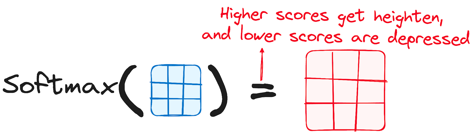 Subsequently, a softmax function is applied to the adjusted scores to obtain the attention weights. This results in probability values ranging from 0 to 1. The softmax function emphasizes higher scores while diminishing lower scores, thereby enhancing the model's ability to effectively determine which words should receive more attention.