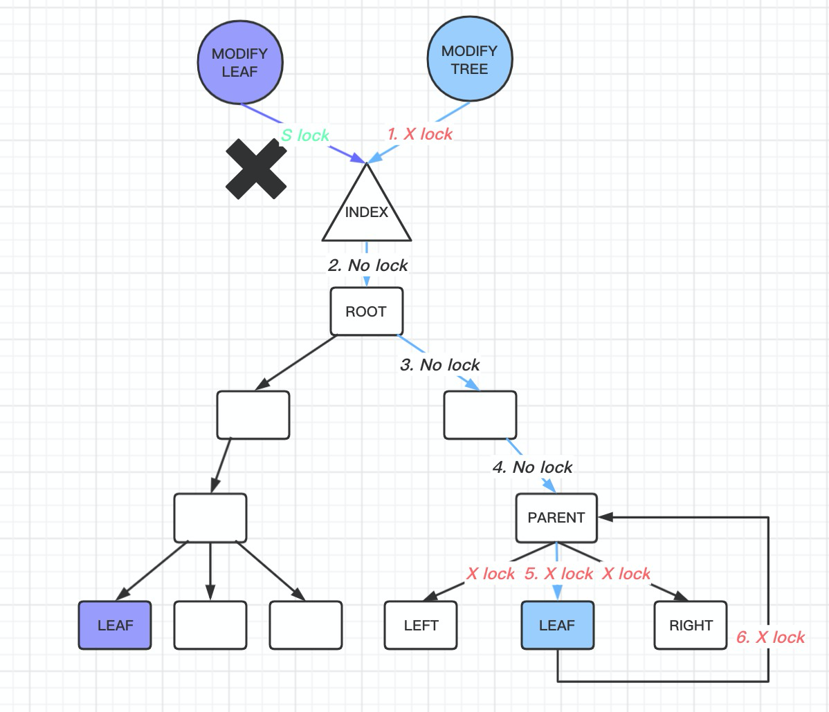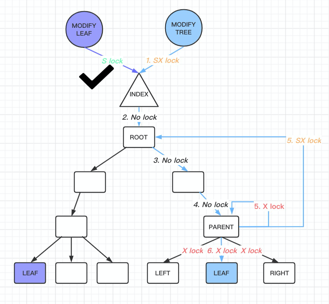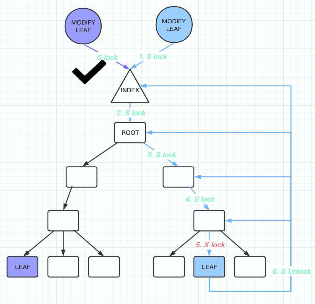 index->lock and S LOCKs on the non-leaf node pages.index->lock. At this point, the situation branches into two scenarios depending on whether the page modification triggers a B-tree structure change: