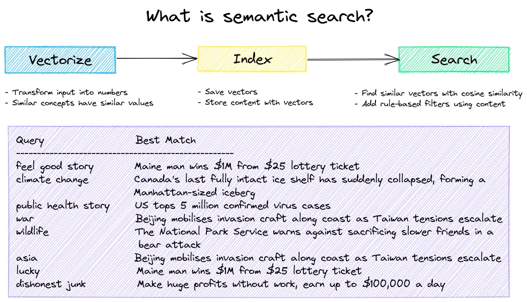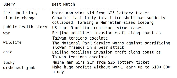 # Create an embeddings embeddings = Embeddings( hybrid=True, path="sentence-transformers/nli-mpnet-base-v2" ) # Create an index for the list of text embeddings.index(data) print("%-20s %s" % ("Query", "Best Match")) print("-" * 50) # Run an embeddings search for each query for query in ("feel good story", "climate change", "public health story", "war", "wildlife", "asia", "lucky", "dishonest junk"): # Extract uid of first result # search result format: (uid, score) uid = embeddings.search(query, 1)[0][0] # Print text print("%-20s %s" % (query, data[uid]))