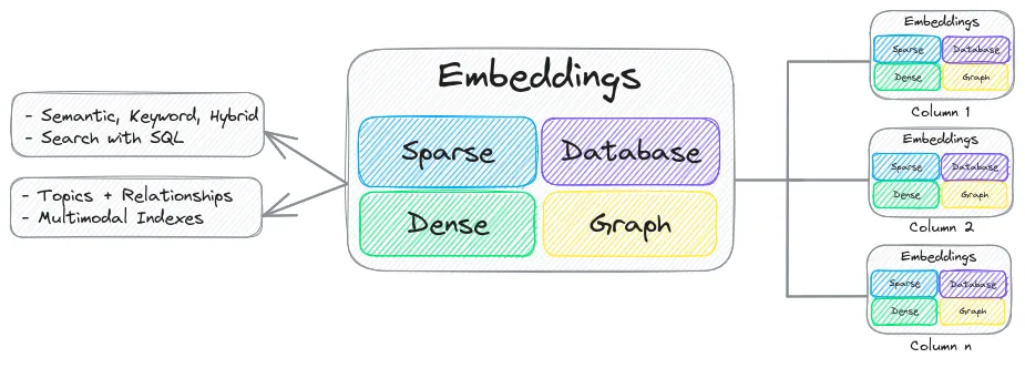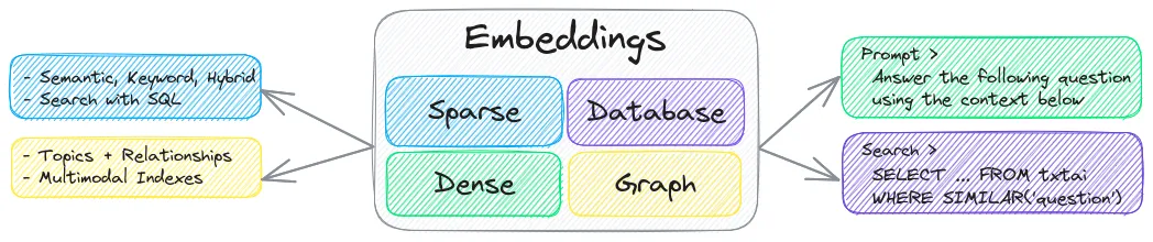 Embeddings databases are a union of vector indexes (sparse and dense), graph networks and relational databases. This enables vector search with SQL, topic modeling, retrieval augmented generation and more.