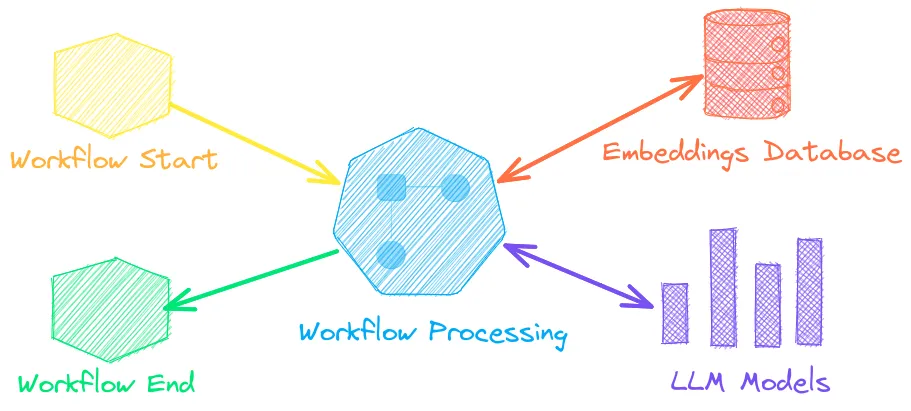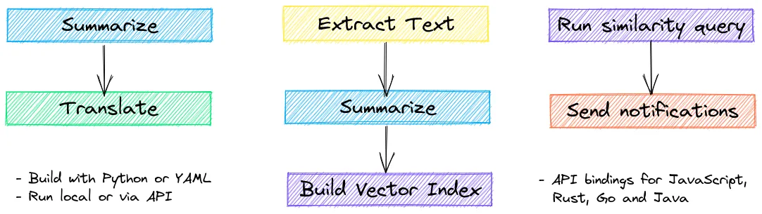 Workflows can run right alongside an embeddings instance, similar to a stored procedure in a relational database. Workflows can be written in either Python or YAML. We’ll demonstrate how to write a workflow with YAML.